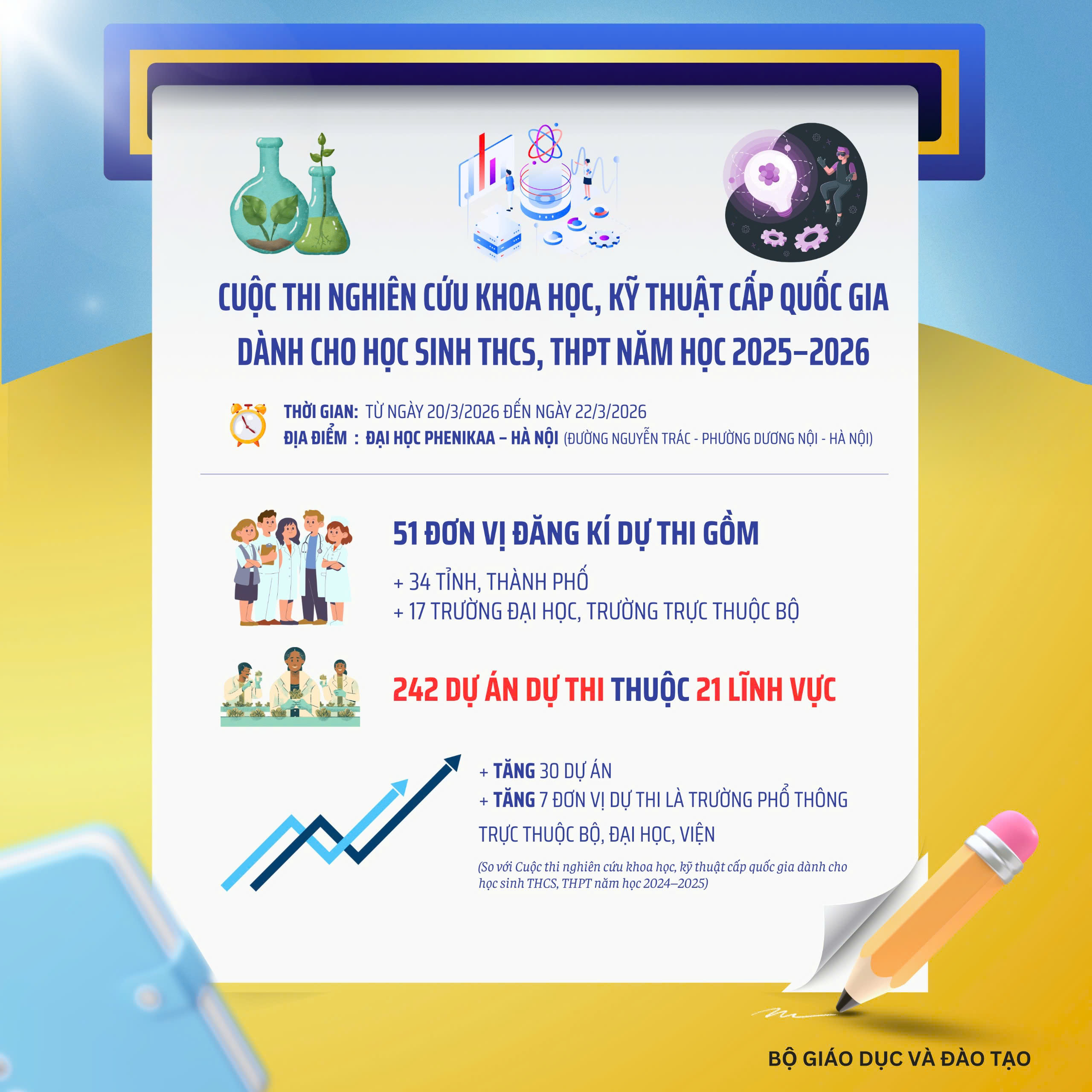 Trong 3 ngày (20, 21, 22/3/2026), tại Đại học Phenikaa, Bộ Giáo dục và Đào tạo (GDĐT) phối hợp với Ủy ban nhân dân Thành phố Hà Nội tổ chức Cuộc thi nghiên cứu khoa học, kỹ thuật (KHKT) cấp quốc gia dành cho học sinh trung học cơ sở (THCS) và trung học phổ thông (THPT) năm học 2025-2026. Cuộc thi do Sở GDĐT Thành phố Hà Nội đăng cai tổ chức.